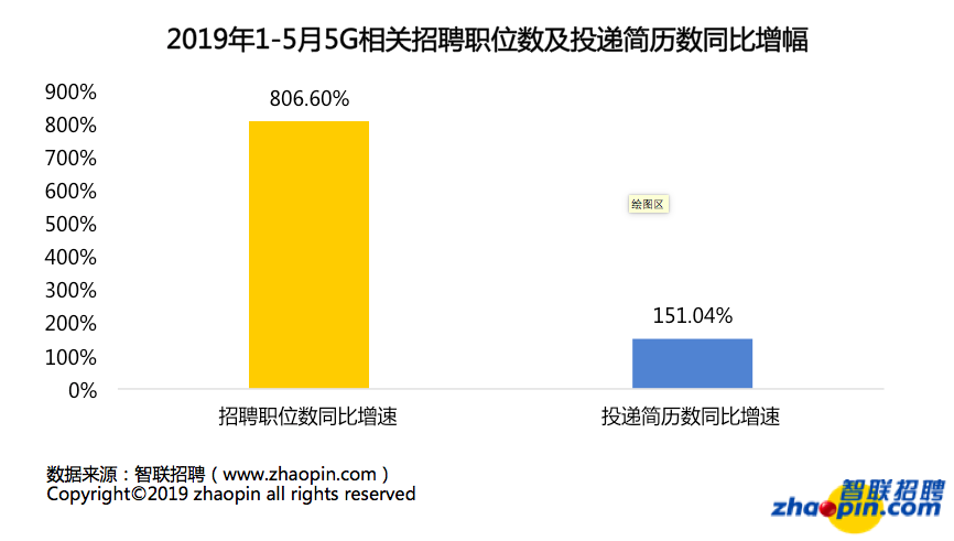 站上风口的5G催生了通讯类人才就业繁荣景象。智联招聘大数据显示,2019年1-5月5G相关招聘职位数同比增速达806.60%,而投递简历同比增速仅为151.04%,供给变化滞后于需求状况更为严重。